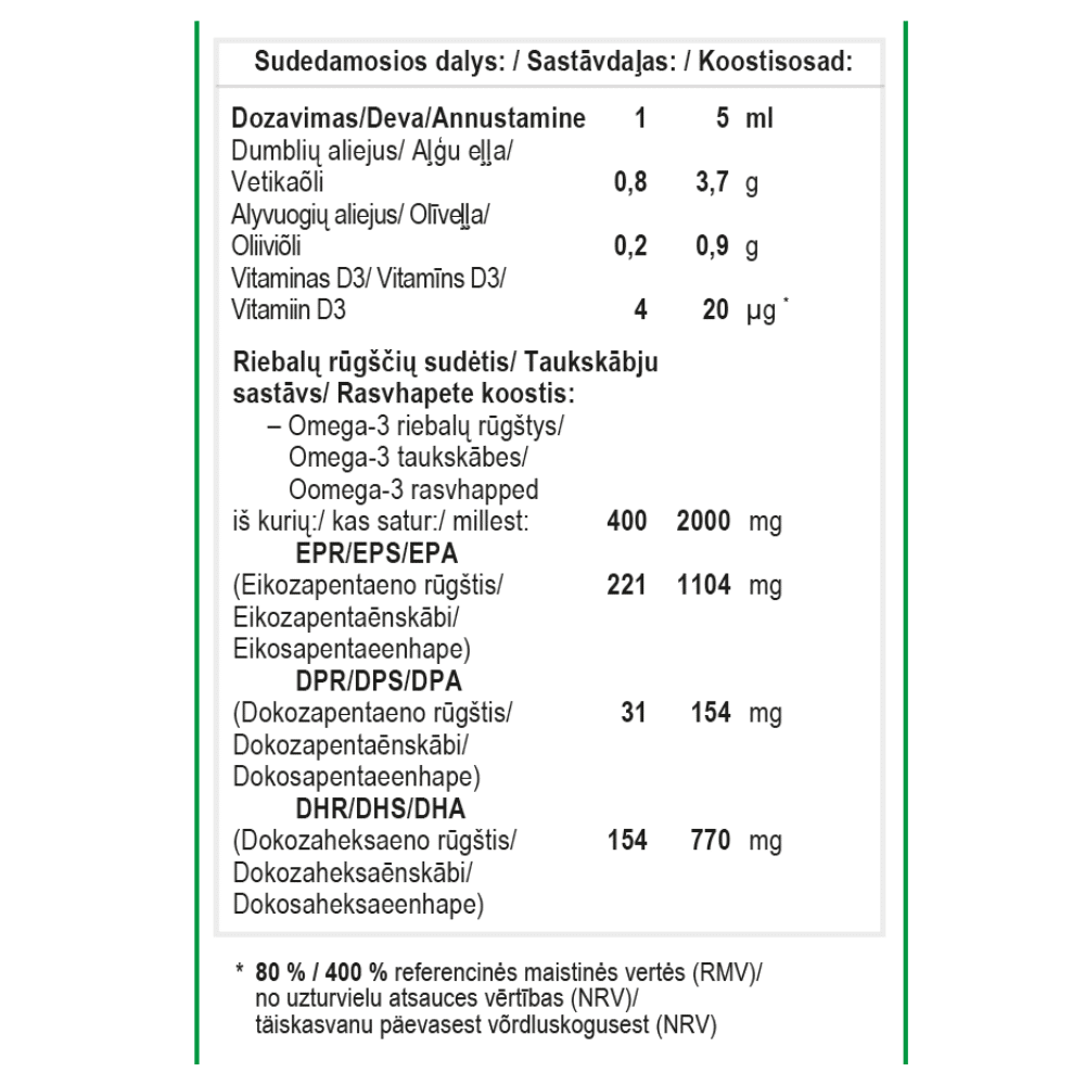 Sudedamosios dalys: mikrodumblių Schizochytrium sp. aliejus, kuriame gausu DHR ir EPR (80%), ypač grynas alyvuogių aliejus (19 %), rozmarinų ekstraktai, tokoferolių koncentruotas ekstraktas ir L-askorbilpalmitatas (antioksidantai), saulėgrąžų aliejus, apelsinų aliejus, D-alfa-tokoferolis (vitaminas E), cholekalciferolis (vitaminas D).