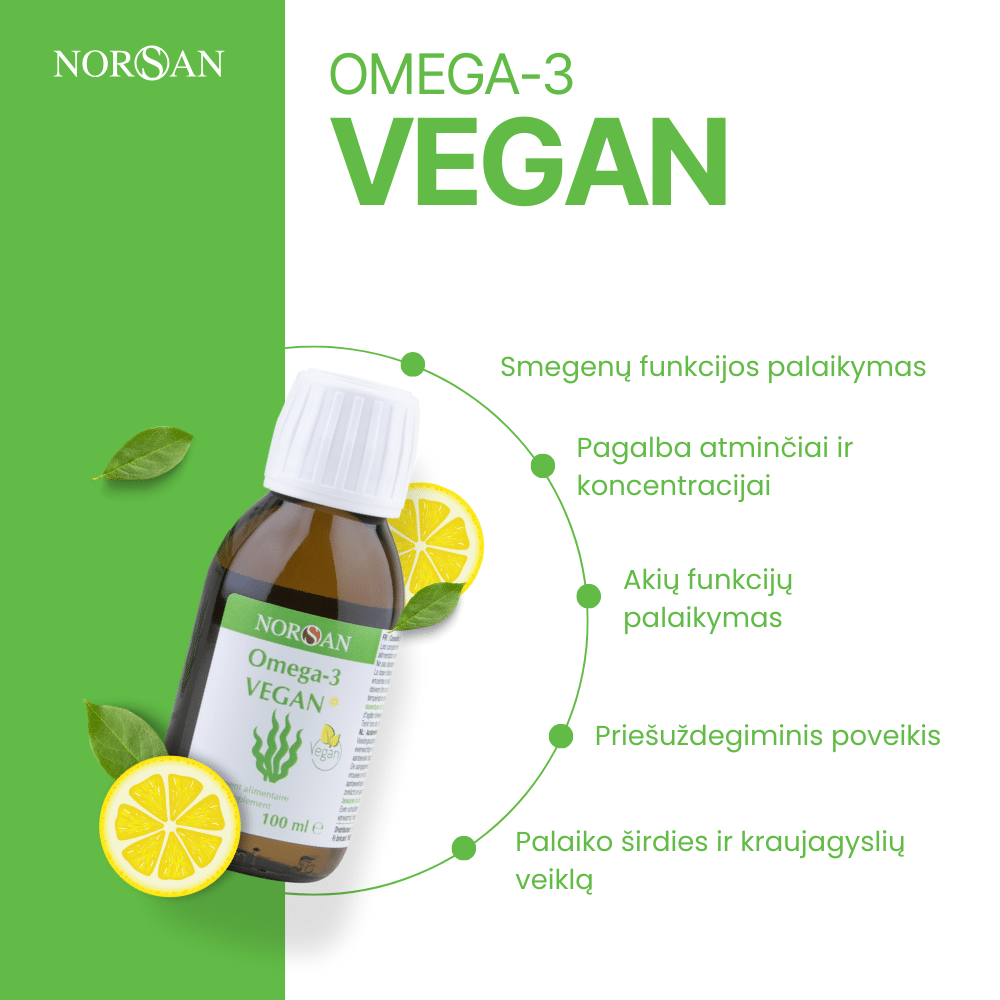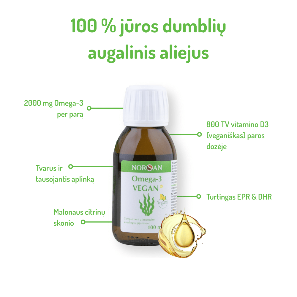 “Omega-3 Vegan” (100 ml) yra unikalus jūros dumblių ir šalto spaudimo alyvuogių aliejaus (antioksidanto), gauto iš kontroliuojamo ekologinio ūkio, derinys. Paros dozėje (5 ml /1 arbatinis šaukštelis) yra 2000 mg Omega-3 riebalų rūgščių. Dumblių aliejuje yra gausu DHR (DHA) ir EPR (EPA) riebalų rūgščių, todėl jis yra optimalus Omega-3 šaltinis tiems, kurie nori iš savo raciono pašalinti bet kokį gyvūninės kilmės produktą.